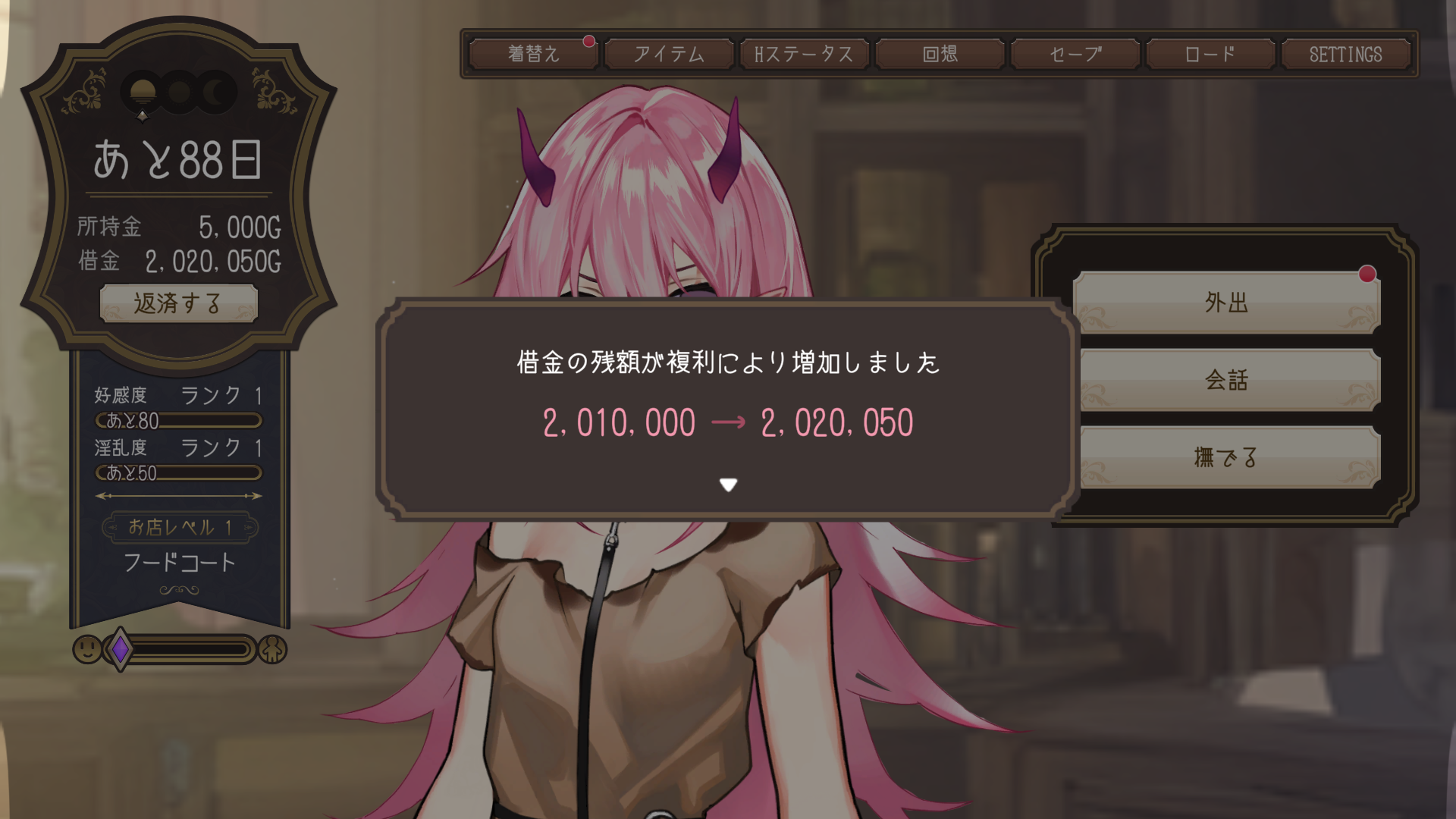 とはいえ100日制限内ではかなり余裕があるので、多少借金返済までにエッチな方の開発もして問題ない難易度です。