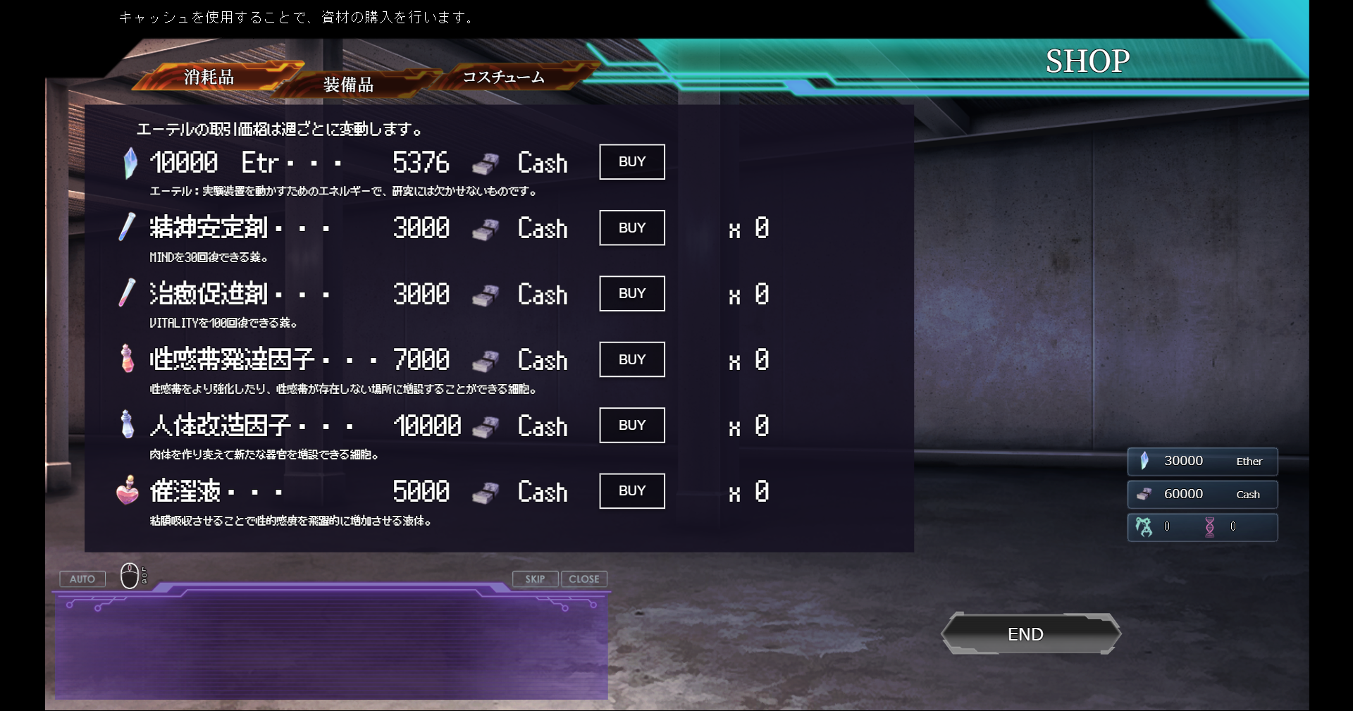 エーテルが無くなるとゲームオーバーになるため、お金とエーテルの維持が最重要になります。